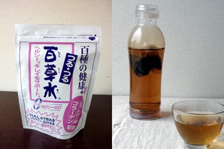 つる・つる百草水はヒアルロン酸・コラーゲンと健康素材の100種類を特殊な方法でブレンドした健康とキレイを差ポートする、美味しくクセのない飲みやすい健康茶です。
